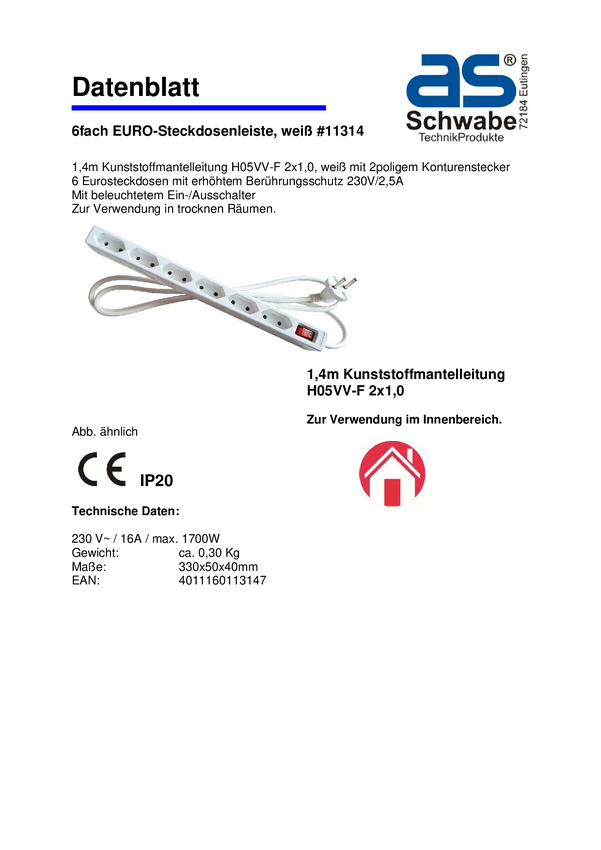 Listwa zasilająca z wyłącznikiem AS Schwabe 11314 Ilość gniazdek: 6