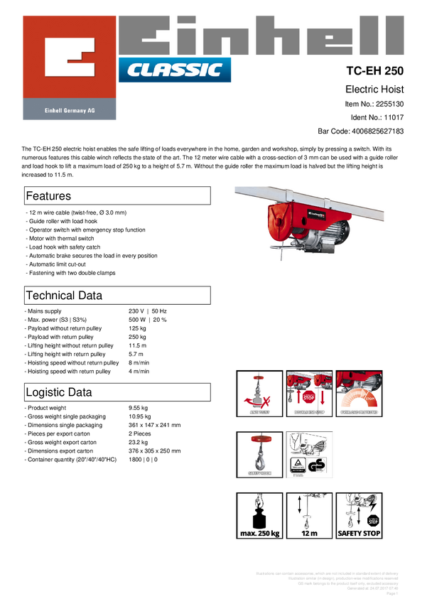 Wyciągarka łańcuchowa Einhell 2255130 Nośność (z rolkami) 250 kg Nośność (bez rolek) 125 kg