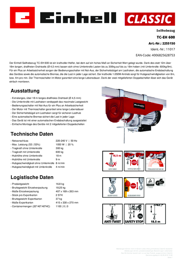 Wyciągarka łańcuchowa Einhell 2255150 Nośność (z rolkami) 600 kg Nośność (bez rolek) 300 kg