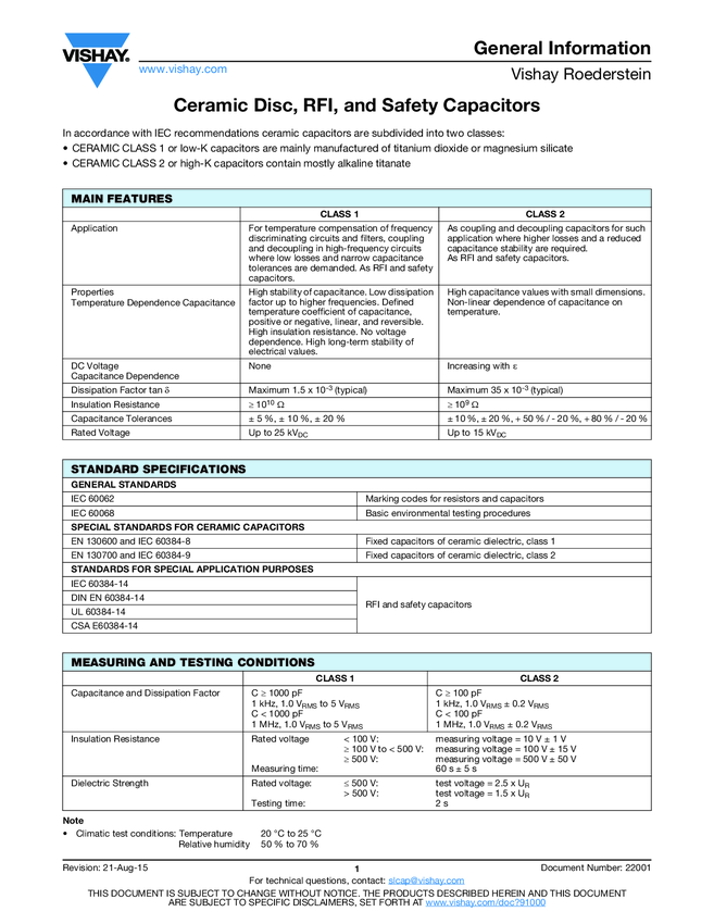 EMI Suppression Capacitor, Ceramic Disc, Class X1, 440 VAC, Class Y2, 250 VAC