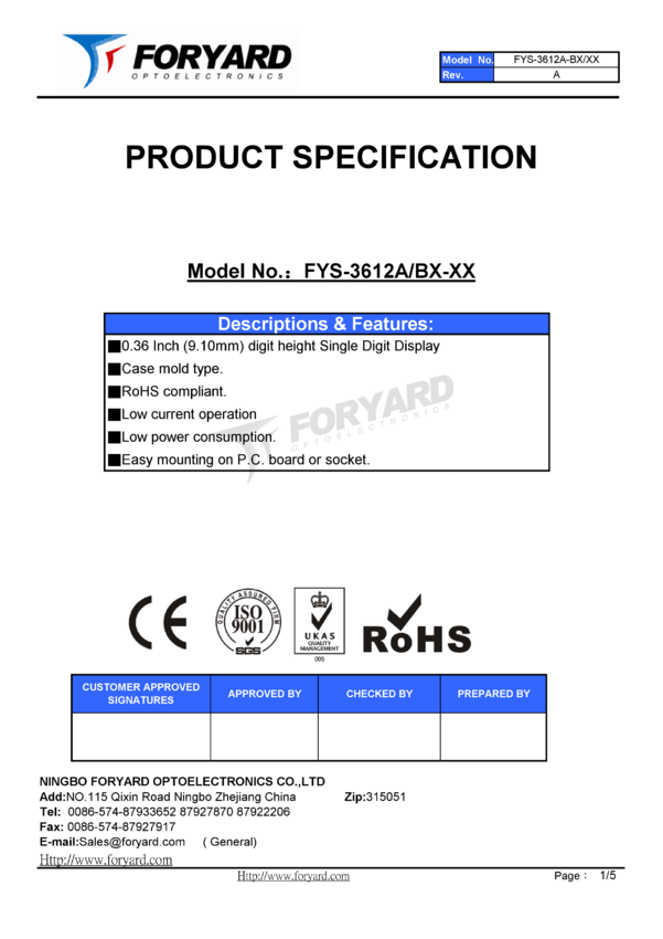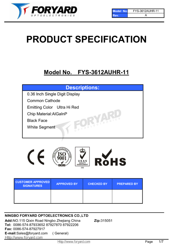 Wyświetlacz LED, ,1-cyfra, 0.36" (9.1mm), wspólna katoda, czarne tło, dyfuzyjny, statyczny, 7.5x14mm, wyprowadzenia PIN typu E3, Foryard