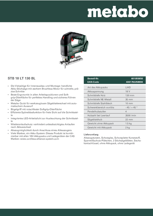 Metabo STB 18 LT 130 BL Wyrzynarka akumulatorowa 601055850 bezszczotkowy, bez akumulatora, bez ładowarki 18 V Ilość dołą