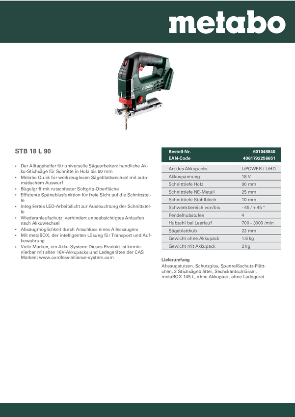 Metabo STB 18 L 90 Wyrzynarka akumulatorowa 601048840 bezszczotkowy, zaw. walizkę, bez akumulatora, bez ładowarki 18 V I