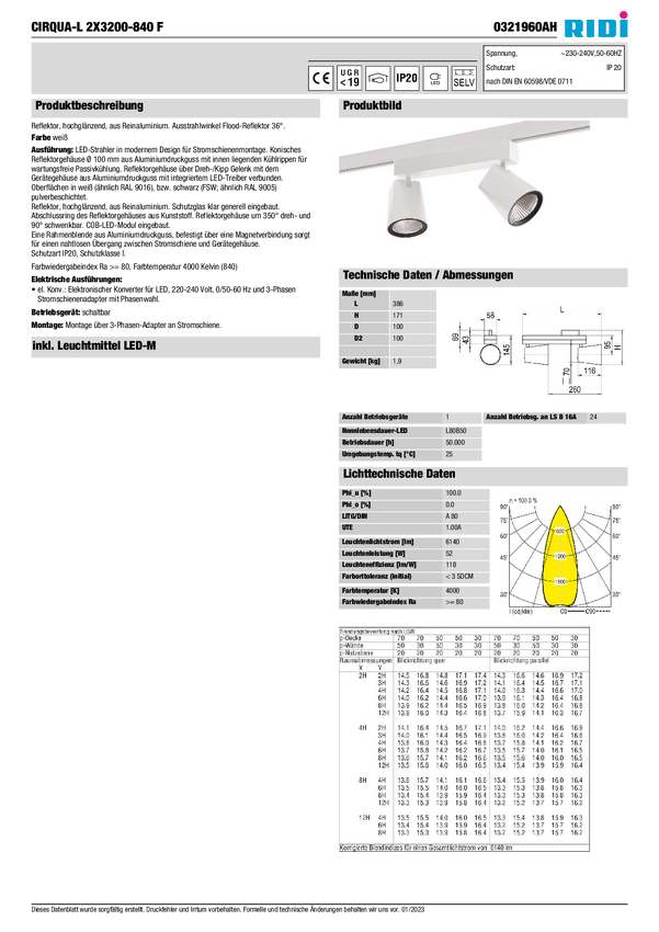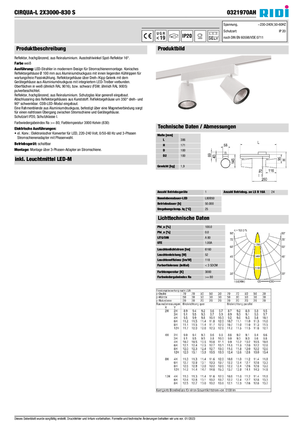 Lampa do systemu szynowego, wysokonapięciowego RIDI 0321960AH 0321960AH LED biały