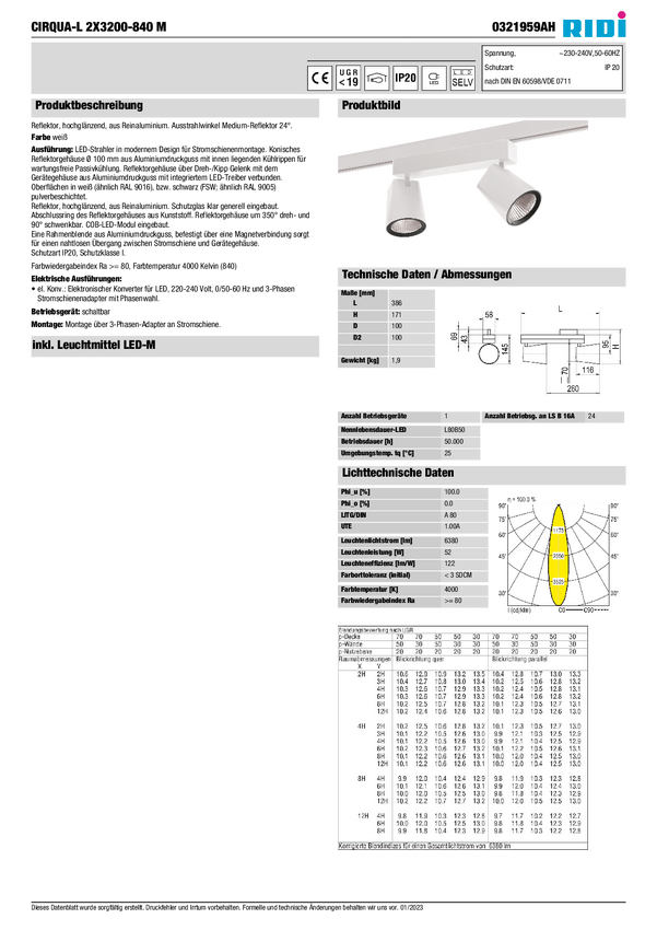 Lampa do systemu szynowego, wysokonapięciowego RIDI 0321973AH 0321973AH LED biały
