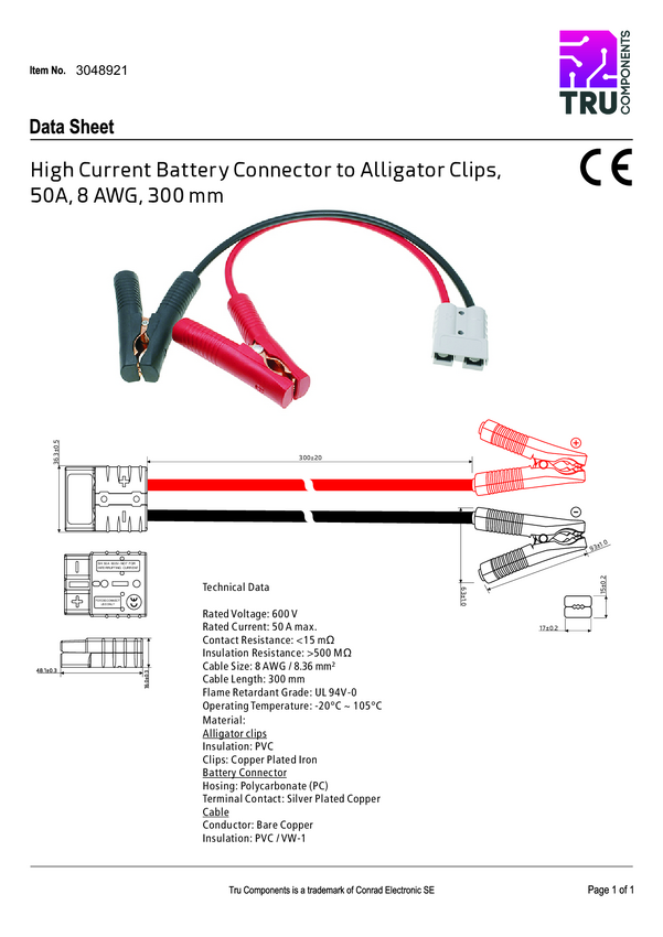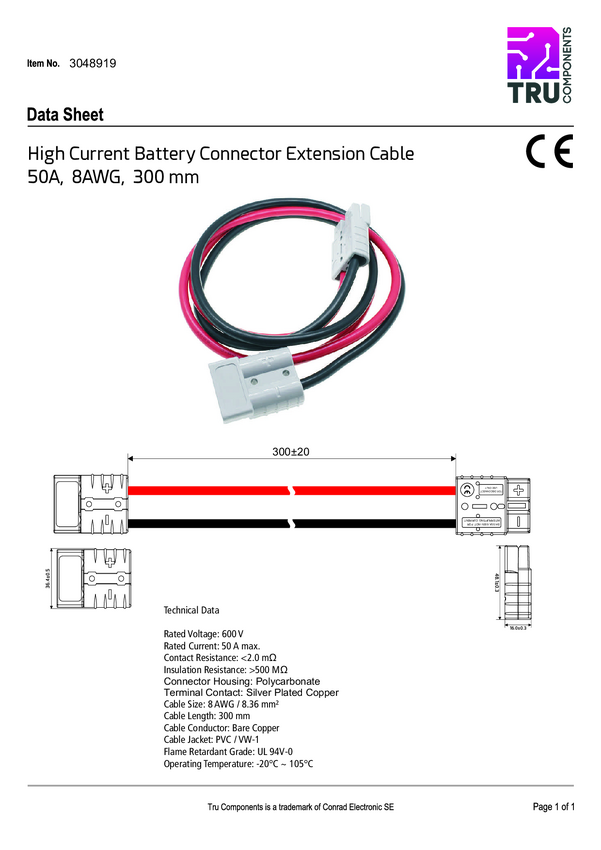 Przedłużacz złącza akumulatora wysokoprądowego 300 mm TC-12195676 czarny, czerwony TRU COMPONENTS Zawartość: 1 szt.