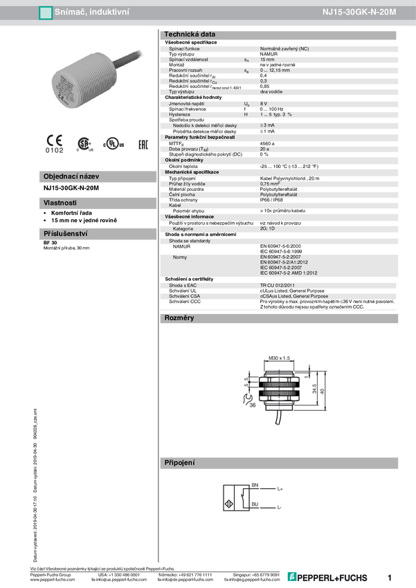 Czujnik indukcyjny Pepperl+Fuchs NJ15-30GK-N x2xG1xxD 70133317 1 szt.