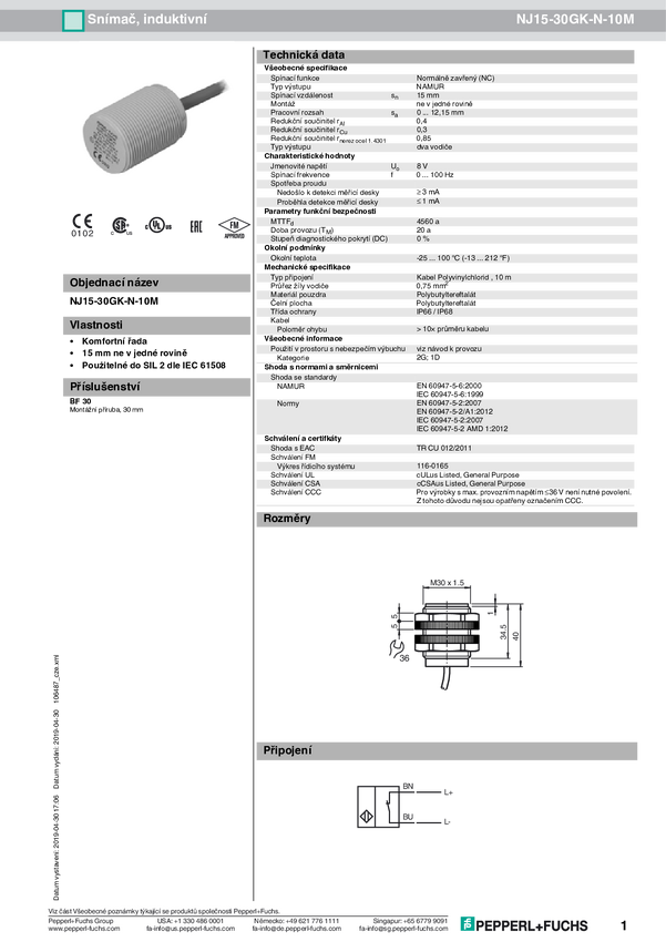 Czujnik indukcyjny Pepperl+Fuchs NJ15-30GK-N-10M x2xG1xxD 70133074 1 szt.