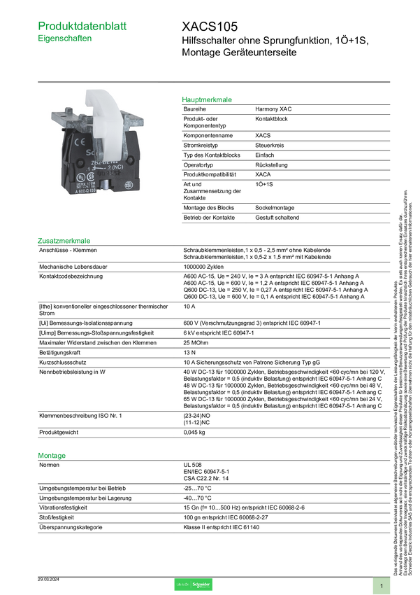 Przełącznik pomocniczy Schneider Electric XACS103, 1 szt.