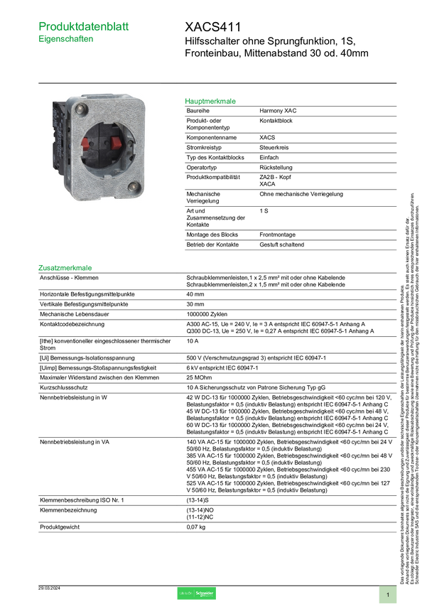 Przełącznik pomocniczy Schneider Electric XACS411 XACS411, 1 szt.