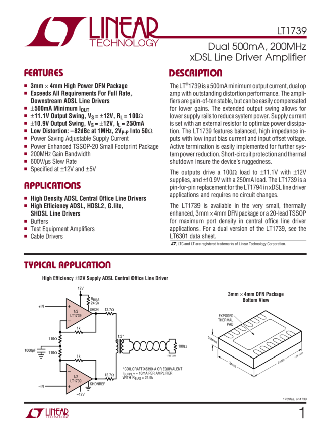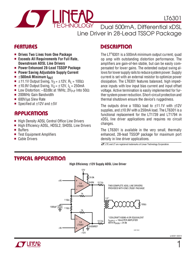 500mA, 200MHz xDSL Line Driver in 16-Lead SSOP Package