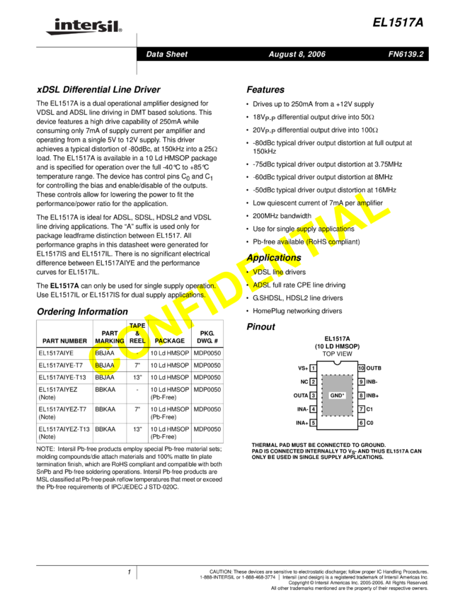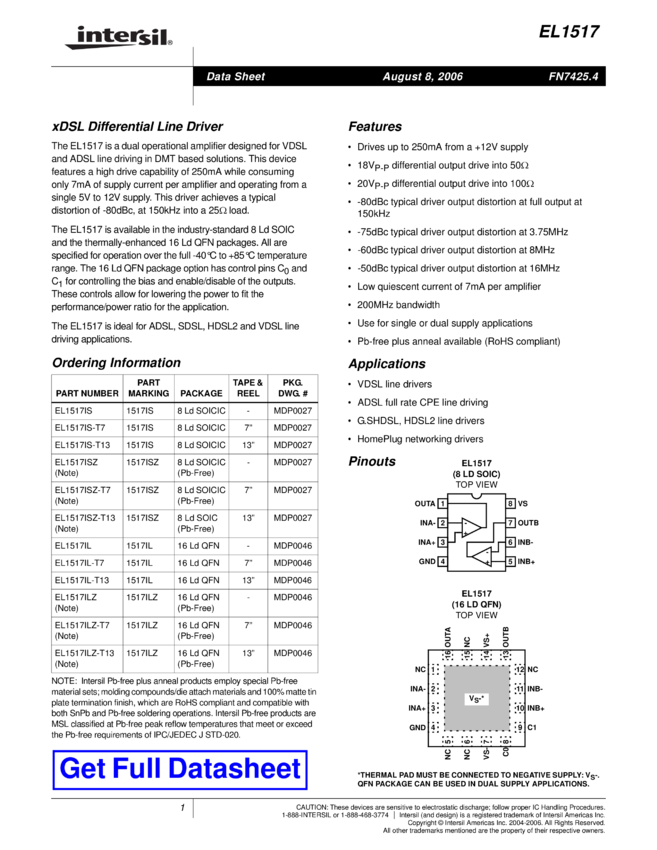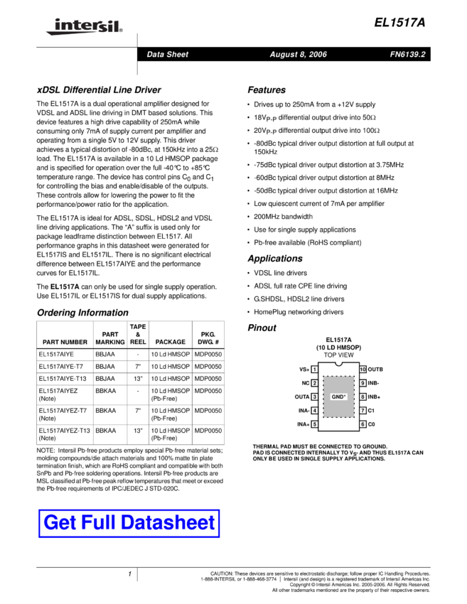 Dual 500mA, 200MHz xDSL Line Driver Amplifier