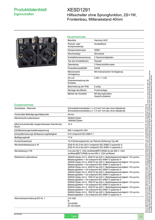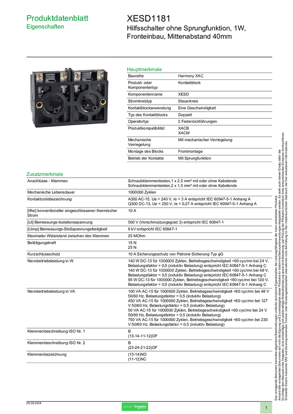 Przełącznik pomocniczy Schneider Electric XESD1281 XESD1281, 1 szt.