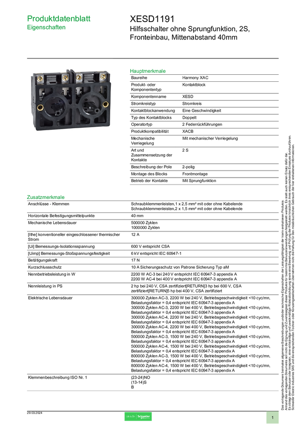 Schneider Electric XESD1291 Przełącznik pomocniczy 1 szt.