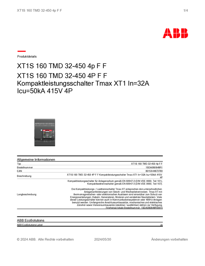 Wyłącznik zasilania ABB XT1S 160 TMD 32-450 4p F F Zakres ustawienia (Prąd): 450 A (max) Maksymalne napięcie przełączani