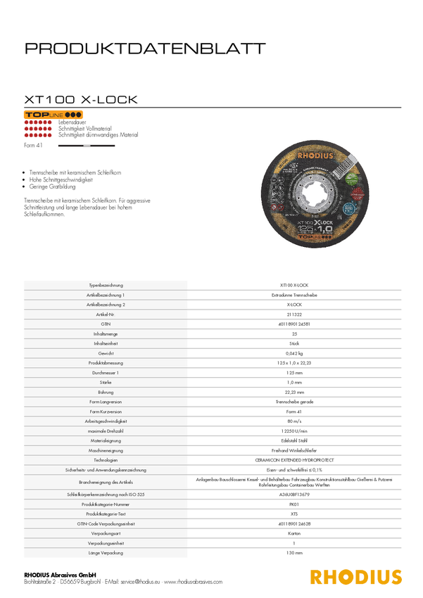 Tarcza tnąca Rhodius XT100 X-LOCK 211321 25 szt.