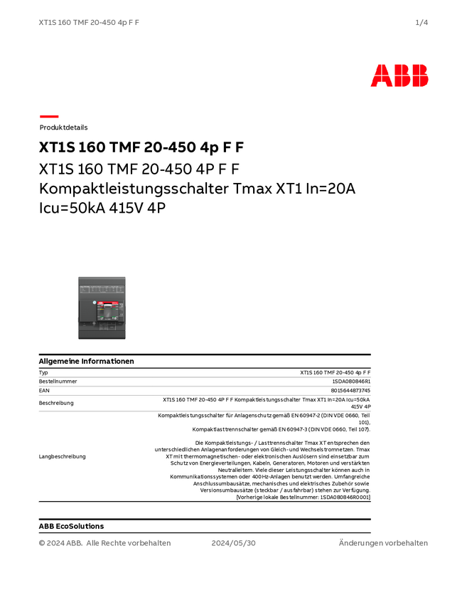 Wyłącznik zasilania ABB XT1S 160 TMF 20-450 4p F F Zakres ustawienia (Prąd): 450 A (max) Maksymalne napięcie przełączani
