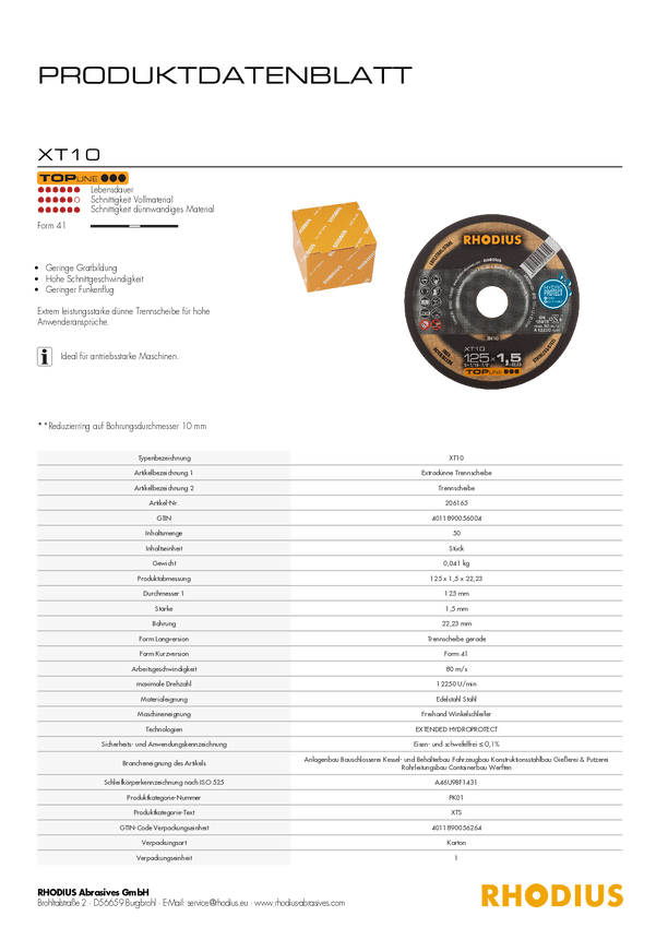 Tarcza tnąca prosta Rhodius XT10 206165 125 mm 1 szt.