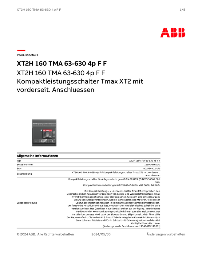 Wyłącznik zasilania ABB XT2S 160 TMA 63-63 Zakres ustawienia (Prąd): 300 - 630 A Maksymalne napięcie przełączania: 220 V