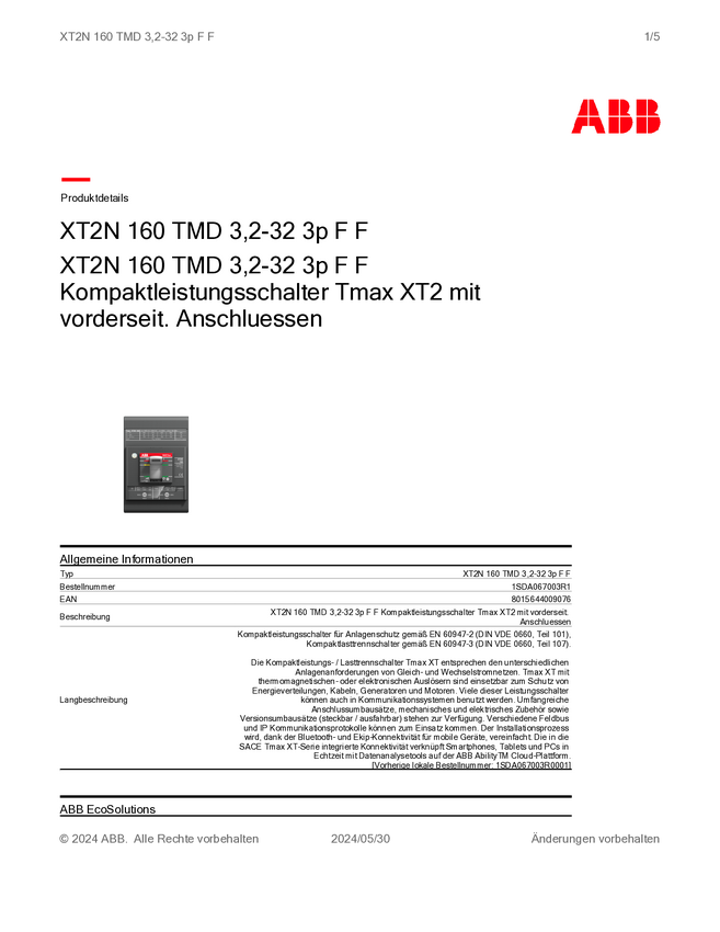 Wyłącznik zasilania ABB XT2N 160 TMD 3,2-3 Zakres ustawienia (Prąd): 32 A (max) Maksymalne napięcie przełączania: 220 V/