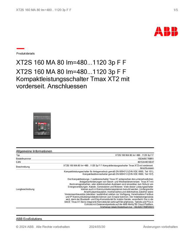 Wyłącznik zasilania ABB XT2S 160 MA 80 IM= Zakres ustawienia (Prąd): 480 - 1120 A Maksymalne napięcie przełączania: 220