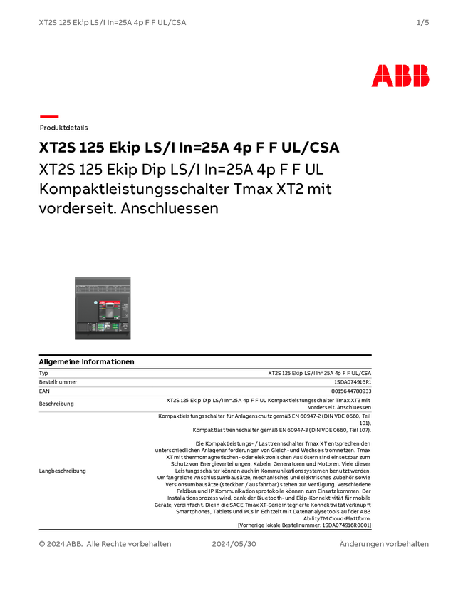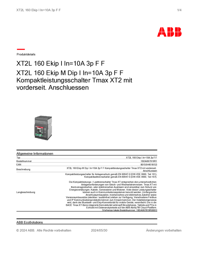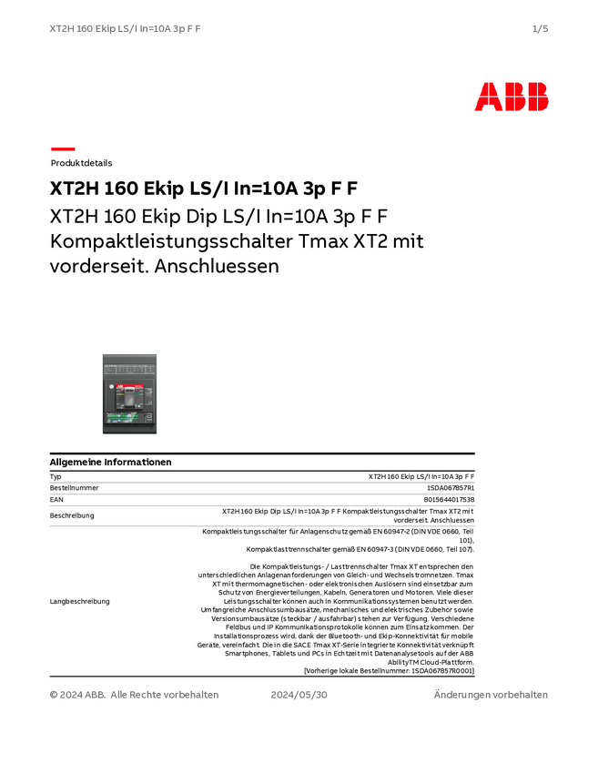 Wyłącznik zasilania ABB XT2N 160 EKIP LSIG Zakres ustawienia (Prąd): 63 - 630 A Maksymalne napięcie przełączania: 220 V/