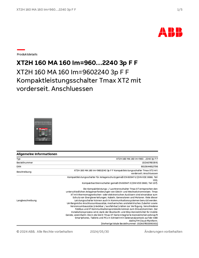 Wyłącznik zasilania ABB XT2H 160 MA 160 IM Zakres ustawienia (Prąd): 960 - 2240 A Maksymalne napięcie przełączania: 220