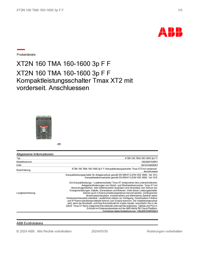 Wyłącznik zasilania ABB XT2N 160 TMA 160-1 Zakres ustawienia (Prąd): 800 - 1600 A Maksymalne napięcie przełączania: 220