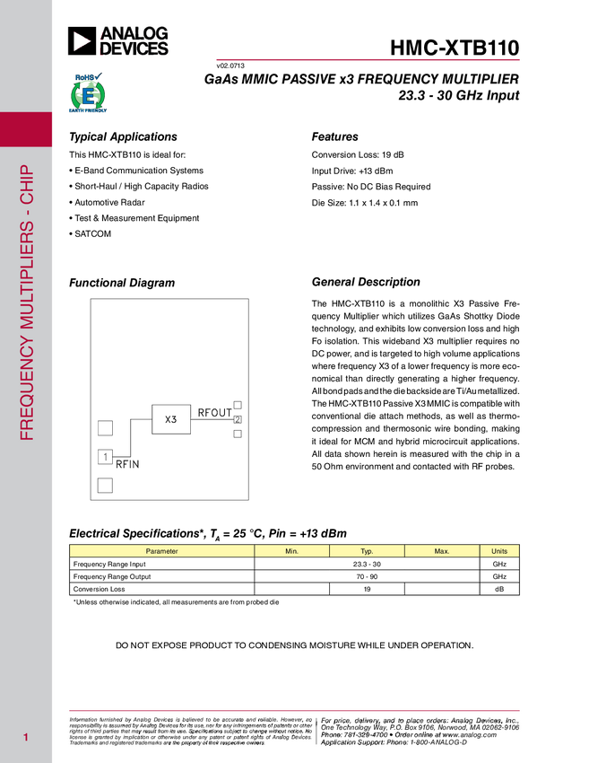 Passive x3 Frequency Multiplier, 24 - 30 GHz Input