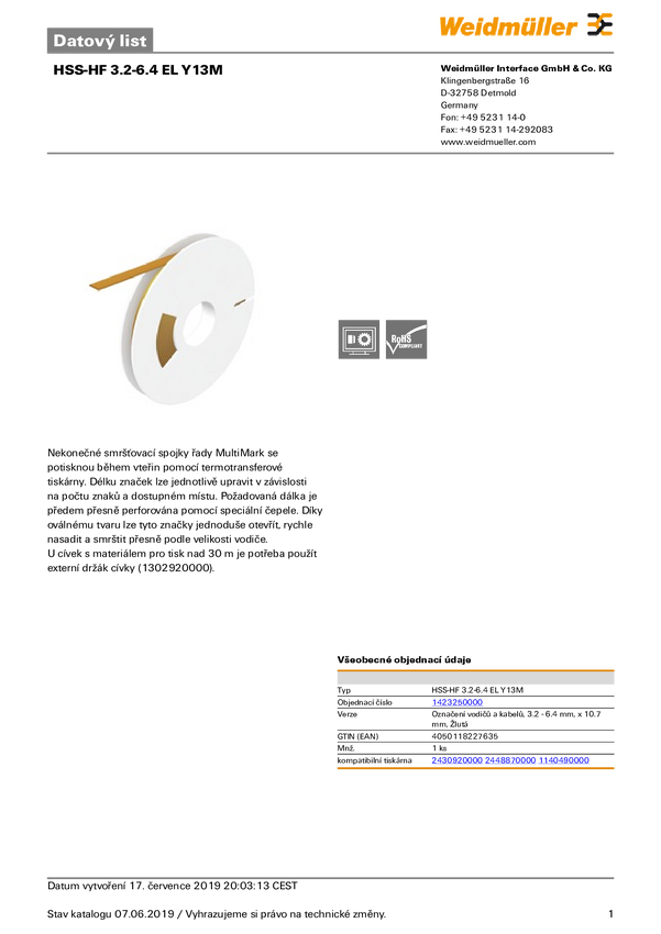System znakowania kabli Weidmüller HSS-HF 3.2-6.4 EL Y13M 1423250000, 1 szt.