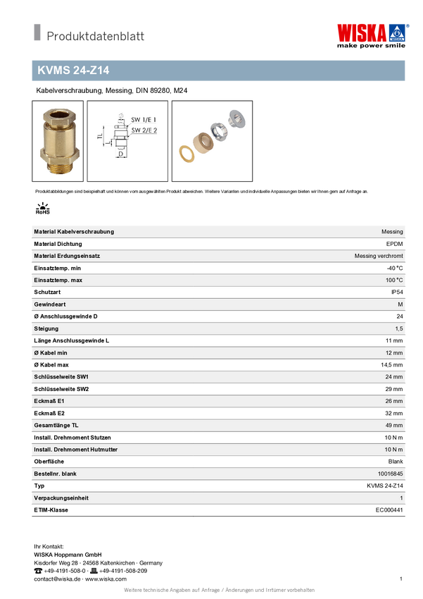 Wiska 10016924 Dławnica kablowa KVMS 24-Z14 Cr, od 12 mm, do 14.5 mm, M24, 1 szt.