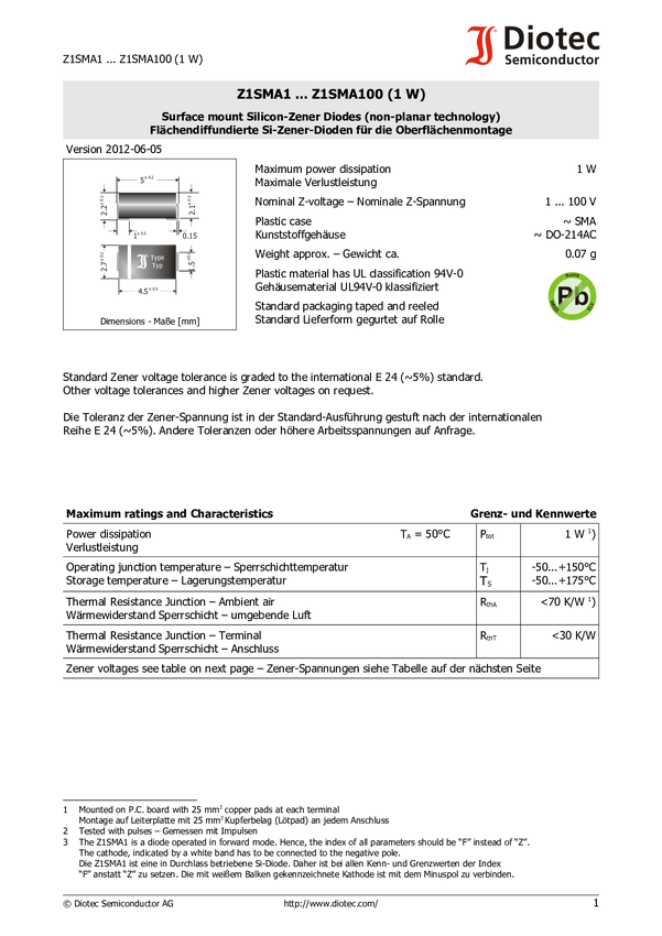 Diotec Dioda Zenera Z1SMA10 Typ obudowy półprzewodnika DO-214AC Napięcie Zenera 10 V Moc (maks) P(TOT) 1 W