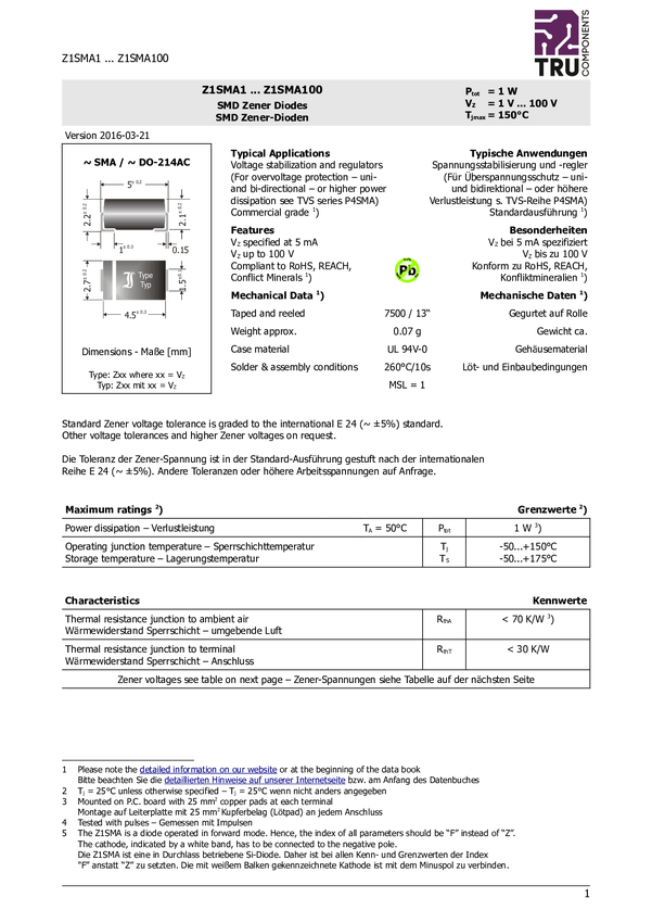 TRU COMPONENTS Dioda Zenera TC-Z1SMA12 Typ obudowy półprzewodnika DO-214AC Napięcie Zenera 12 V Moc (maks) P(TOT) 1 W