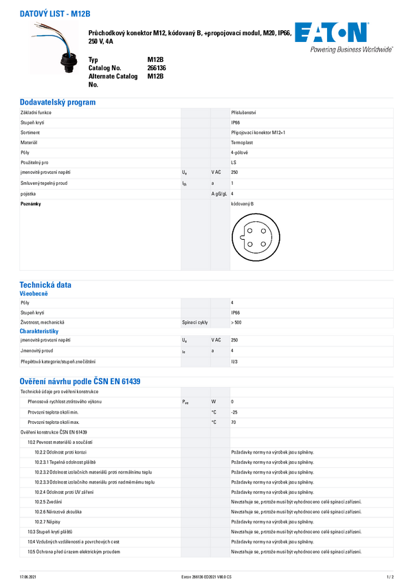 Eaton 266136 Złącze męskie do zabudowy M12 M12B, 250 V, IP66, 1 szt.