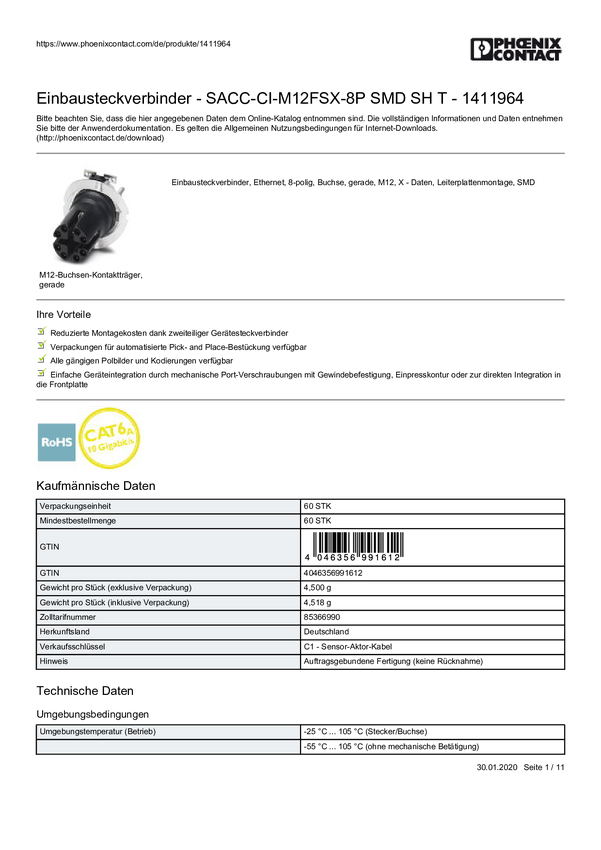 Phoenix Contact 1411991 Złącze czujnika/aktuatora do zabudowy SACC-CIP-M12FSD-4P SMD R32, piny: 4, 100 szt.