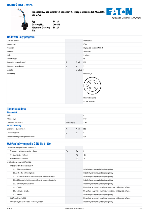 Eaton 266135 Złącze męskie do zabudowy M12 M12A, 250 V, IP66, 1 szt.