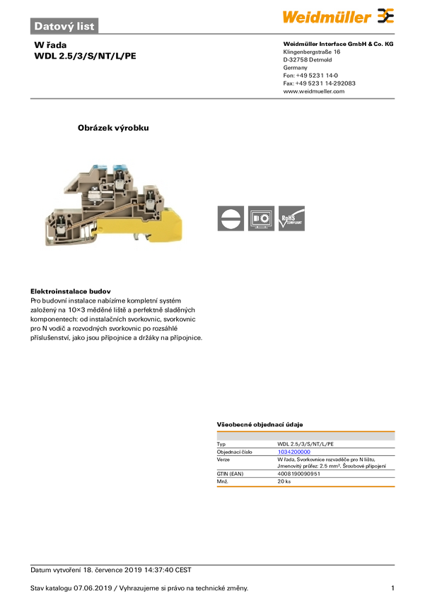 Rozdzielacz zaciskowy szeregowy Weidmüller 1034200000 śrubowe 20 szt.