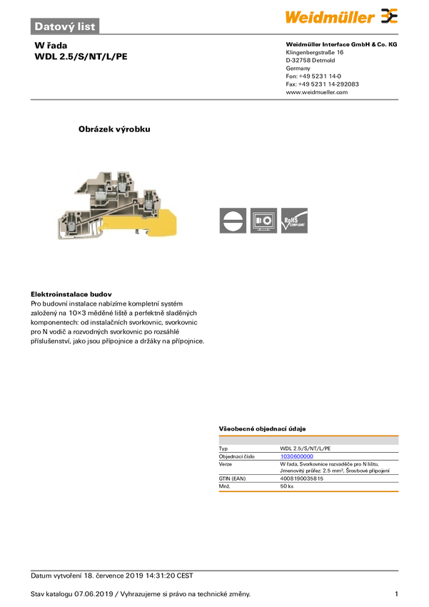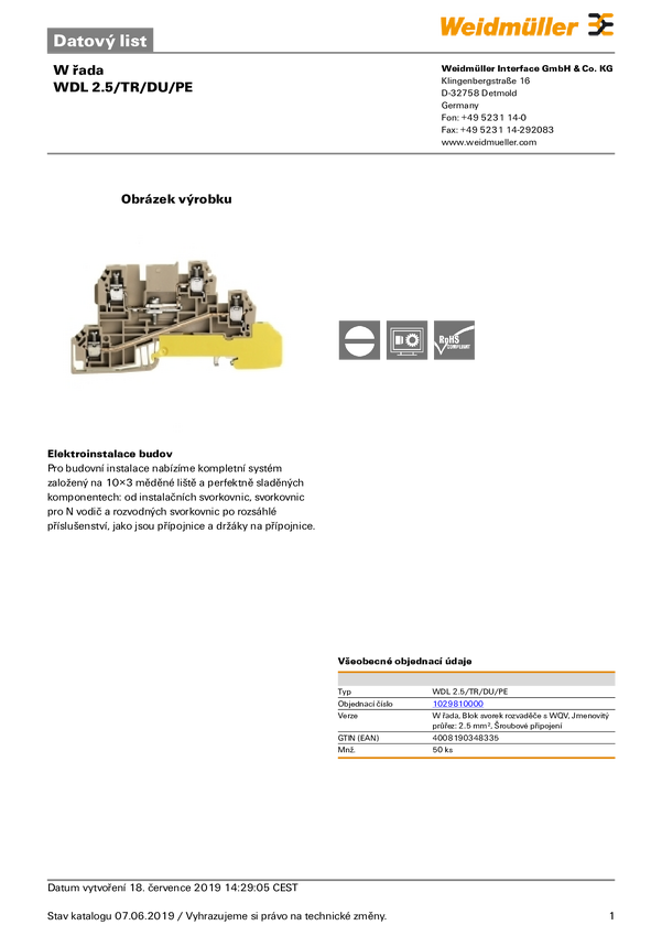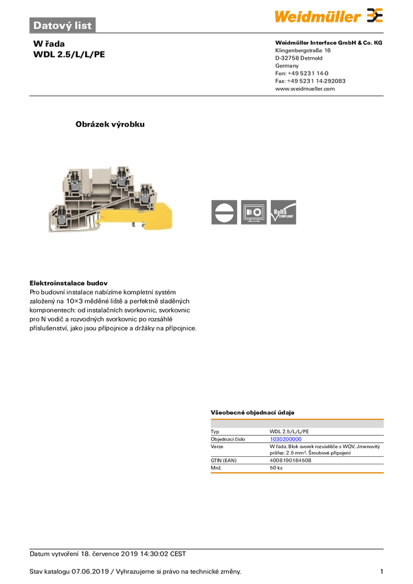 Rozdzielacz zaciskowy szeregowy Weidmüller 2581700000 zacisk push-in 50 szt.
