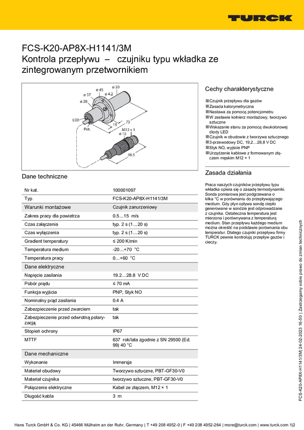 Turck 100001097 Czujnik zanurzeniowy FCS-K20-AP8X-H1141/3M, 19.2 - 28.8 V/DC, 1 szt.