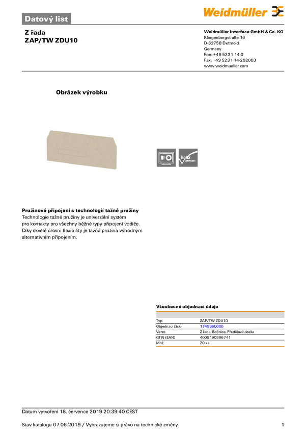 Płyta zamykająca Weidmüller ZAP/TW ZDU10 1748660000-20, 20 szt.