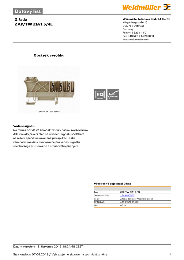 Płyta zamykająca Weidmüller ZAP/TW ZIA1.5/4L 1649550000-50, 50 szt.