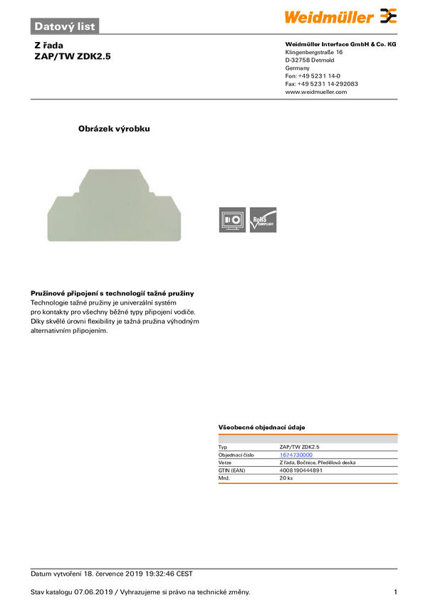 Płyta zamykająca Weidmüller ZAP/TW ZDK2.5 1674730000-20, 20 szt.