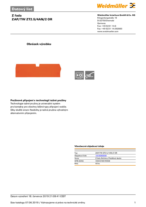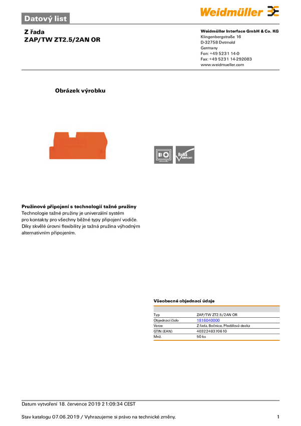 Płyta zamykająca Weidmüller ZAP/TW ZT2.5/2AN OR 1816040000, 50 szt.
