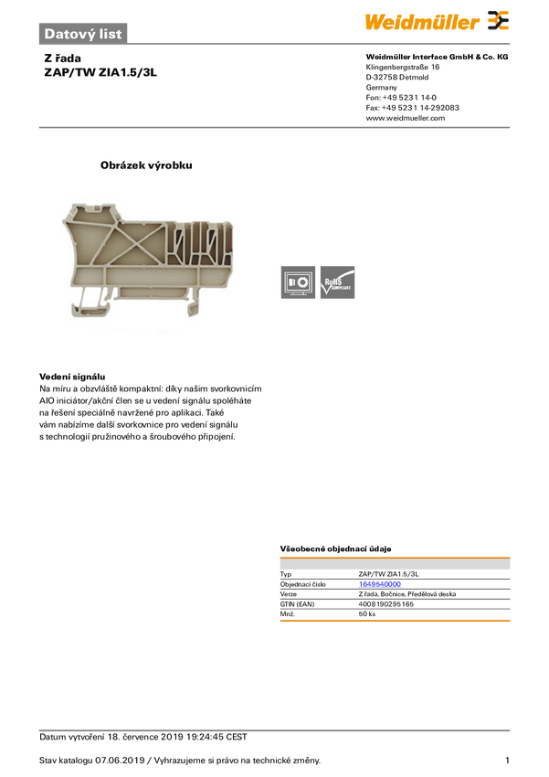 Płyta zamykająca Weidmüller ZAP/TW ZIA1.5/3L 1649540000-50, 50 szt.