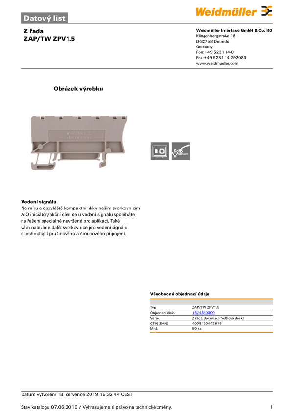 Płyta zamykająca Weidmüller ZAP/TW ZPV1.5 1674650000, 50 szt.