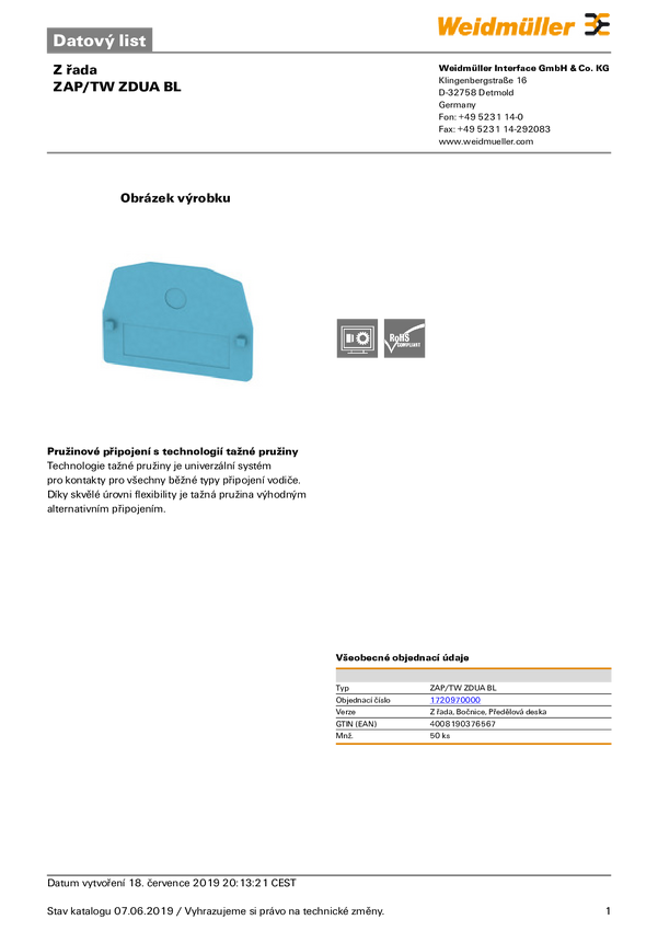 Płyta zamykająca Weidmüller ZAP/TW ZDUA BL 1720970000, 50 szt.