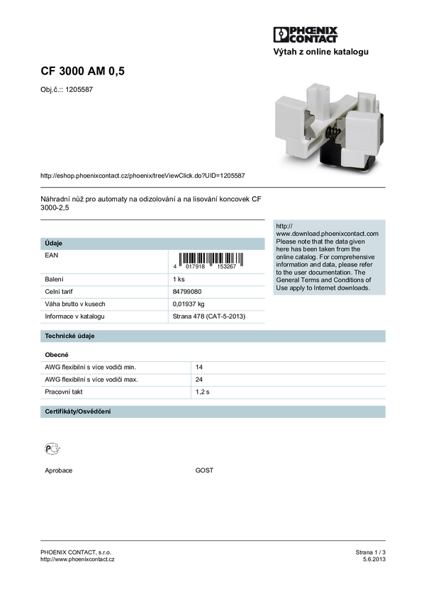 Nóż zapasowy CF 3000 AM 0,5 Phoenix Contact 1205587