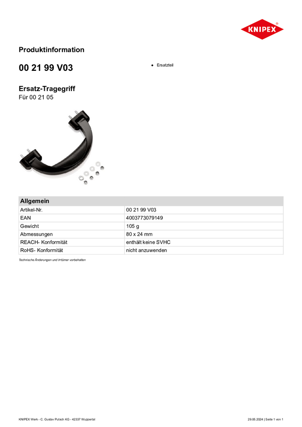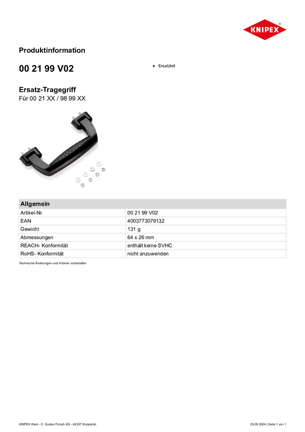 Knipex 00 21 99 V03 Zapasowy uchwyt do przenoszenia Knipex-Werk 1 szt.