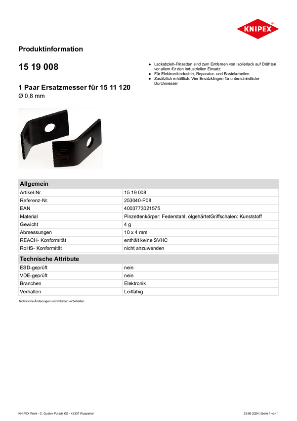 Zapasowy nóż do pęsety do ściągania izolacji Knipex 15 19 008