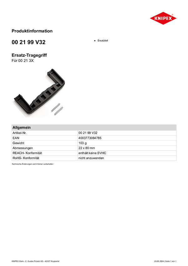 Knipex 00 21 99 V32 Zapasowy uchwyt do przenoszenia Knipex-Werk 1 szt.